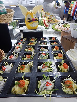 The main reason that the card classes are out today is the Galley Lunch Buffet in the Compass Rose where the classes meet. This is a favorite special treat the Chef does on longer cruises. It is a lot of work for the staff since they serve from the kitchen that has been decorated to the nines! The food displays are a work of art. The kitchen is open for pictures at 11AM and the serving is from 11:30AM until 1:30PM. Dick and Carolyn go about noon and enjoy lot of different delicious bites.